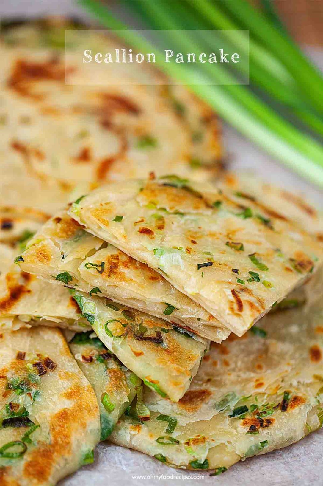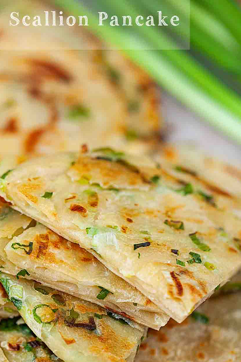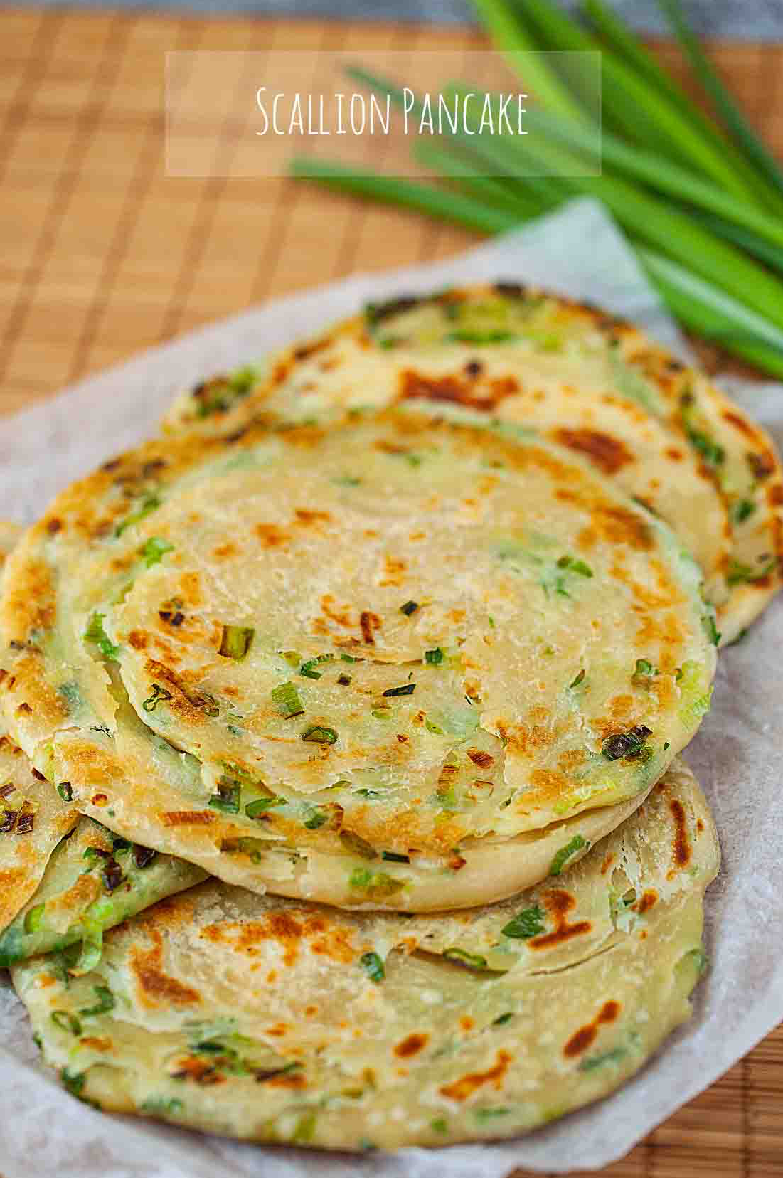 Scallion pancake is a popular Chinese cuisine that serves as a street food item and restaurant dish. Also, it is called cong you bing in Mandarin Chinese and literally translates as scallion oil pancake or green onion oil pancake. Although it is called pancake, this Chinese green onion pancake is different from western pancakes that are made from a dough instead of a batter.