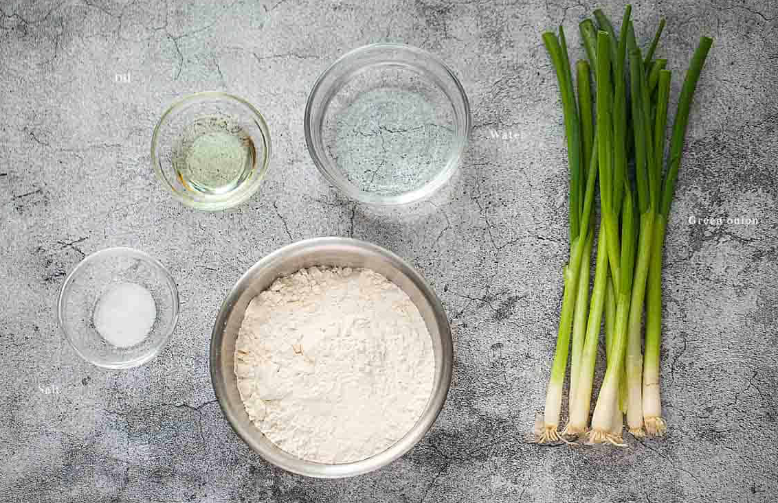 In this cong you bing recipe, the ingredients are flour, salt, water, green onion and oil.