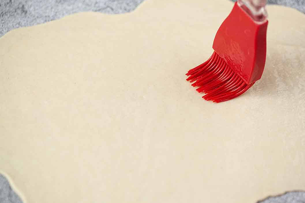 - Bush some oil on the dough, then use the palm to press down the dough and flatten it.