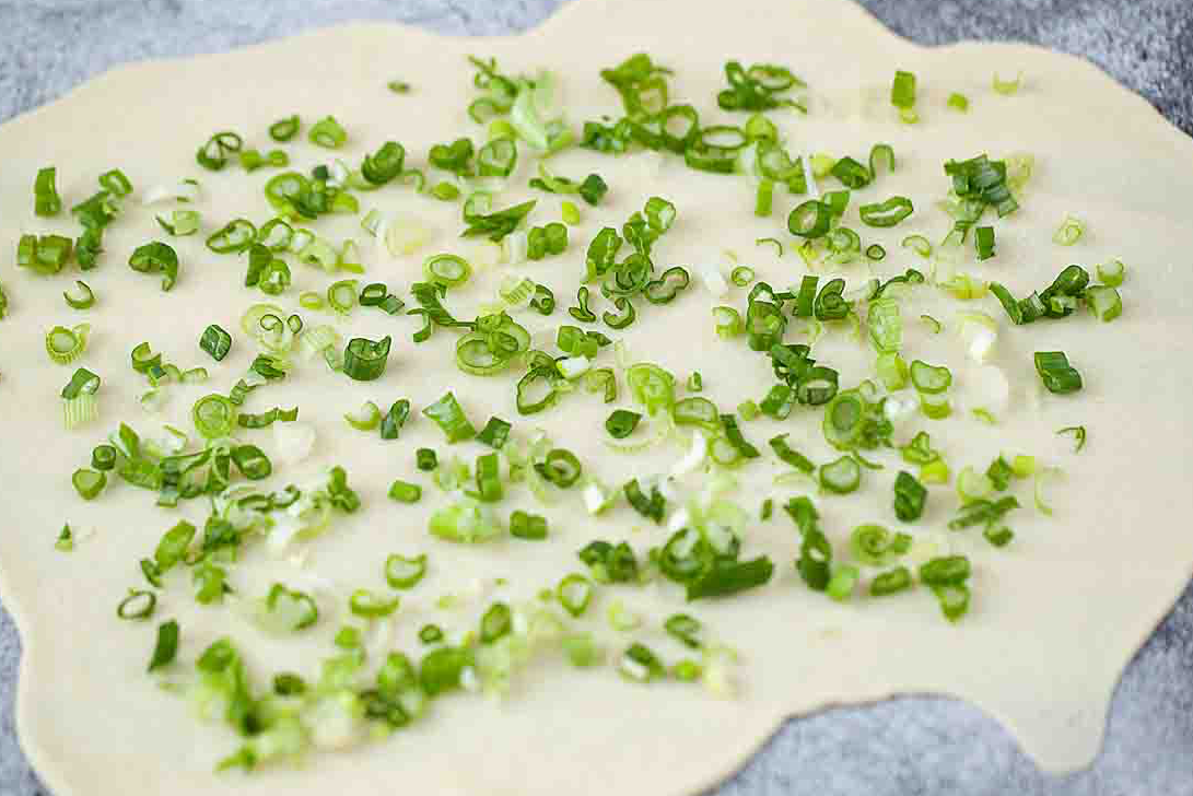 - Sprinkle some salt on the flatten dough and put some cut green onion.
